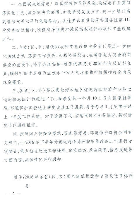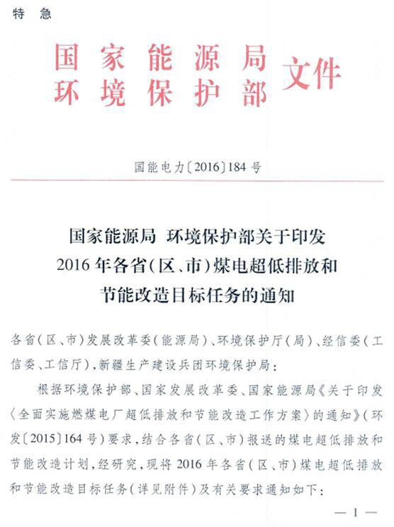 國家能源局、環(huán)保部印發(fā)關(guān)于2016年各?。▍^(qū)、市)煤電超低排放和節(jié)能改造目標(biāo)任務(wù)的通知